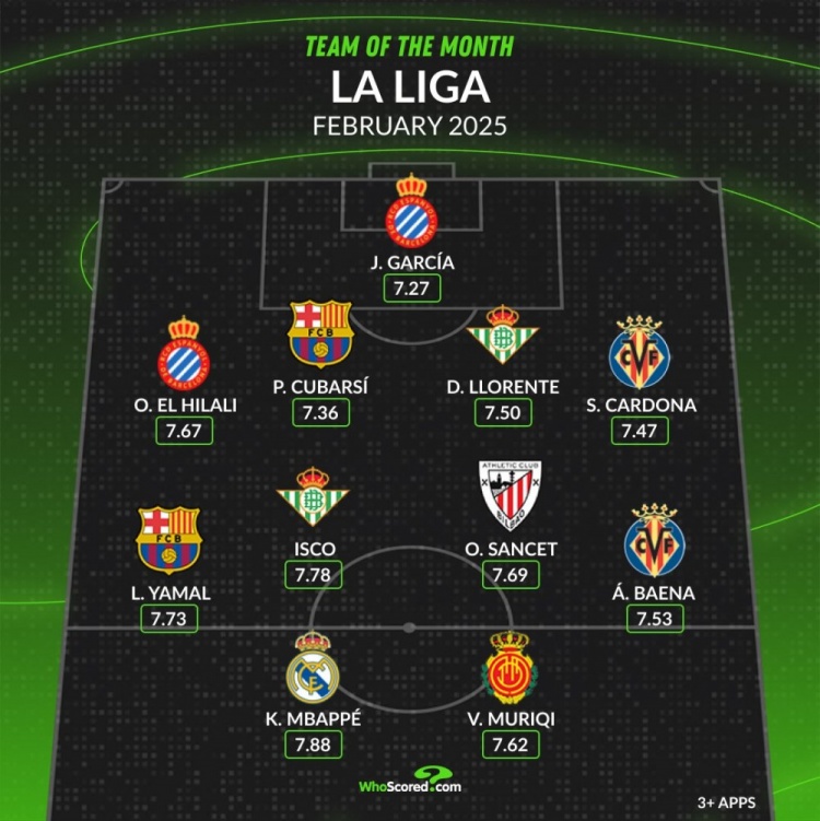 2025-03-02 21:44:18whoscored西甲2月最佳陣:姆巴佩、亞馬爾領銜,伊斯科在列
