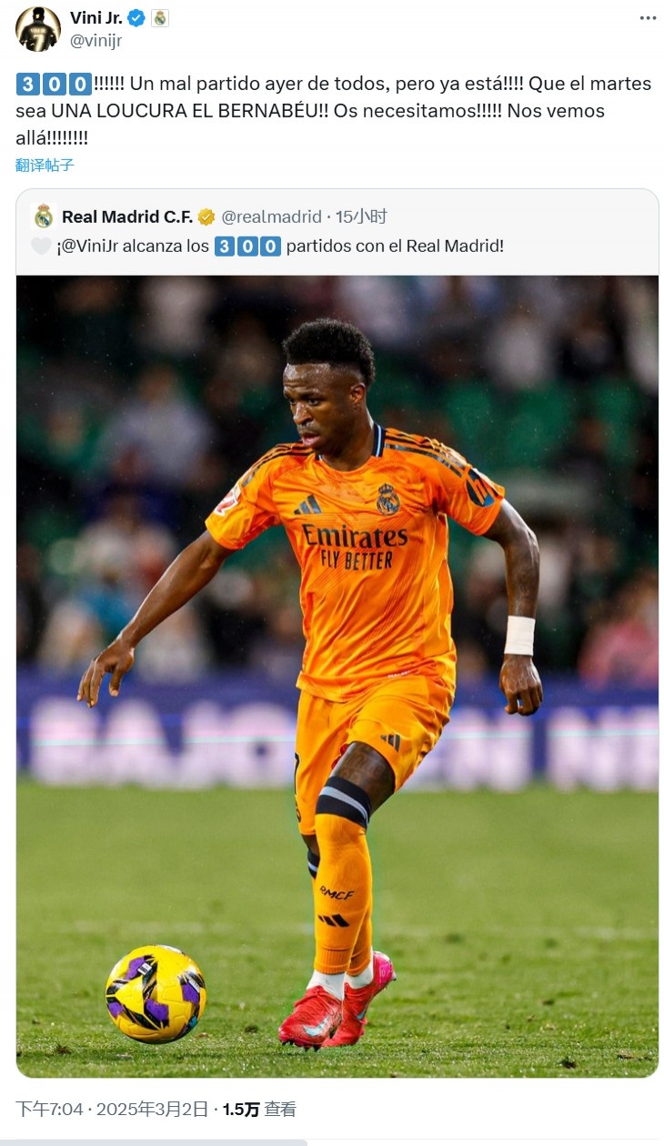 2025-03-02 21:44:41維尼修斯社媒:300場里程碑!一場糟糕的失利,但下周二還有大戰(zhàn)