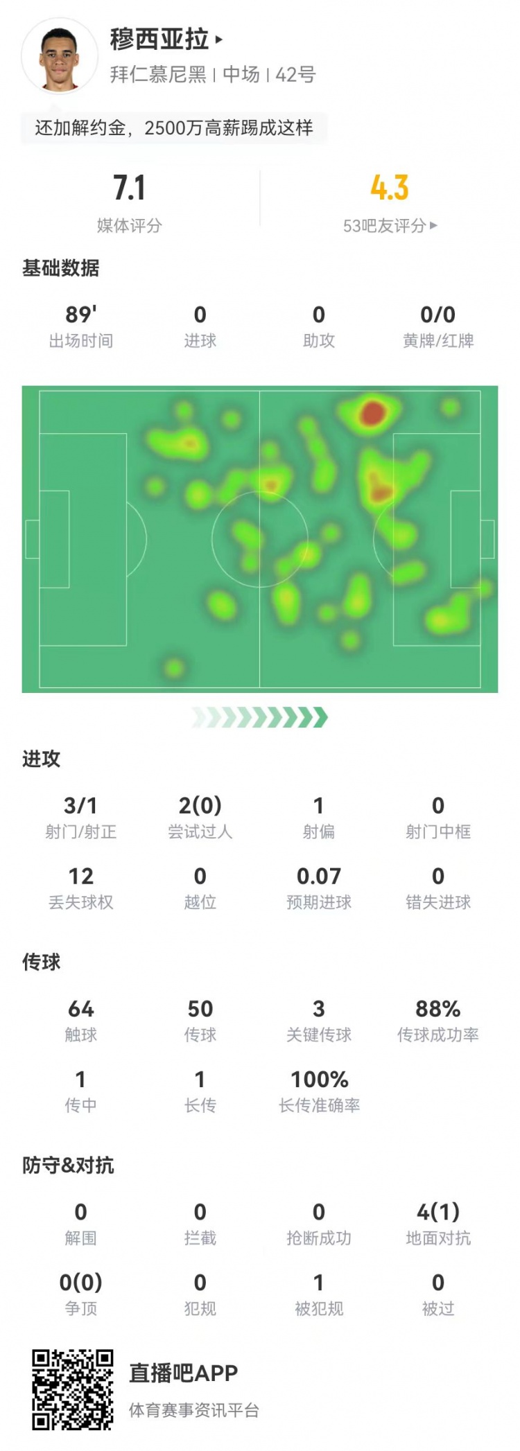 2025-02-19 20:28:30穆西亞拉本場數據:3射1正 2過人0成功 3關鍵傳球 4對抗1成功