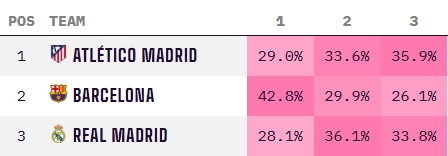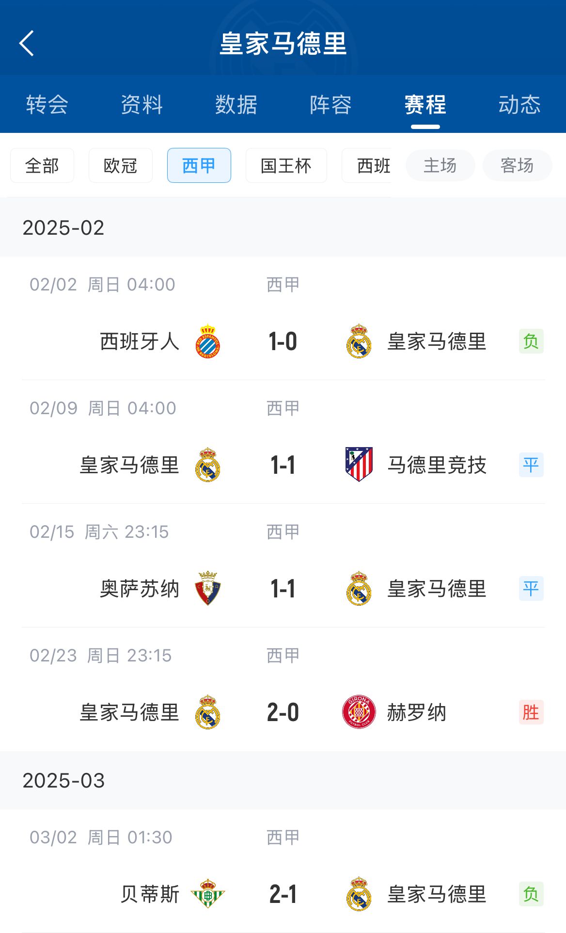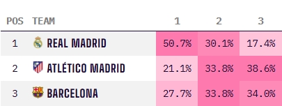 2025-03-02 21:46:415輪僅1勝!皇馬西甲奪冠概率腰斬跌至三強墊底,兩周前還51%領跑