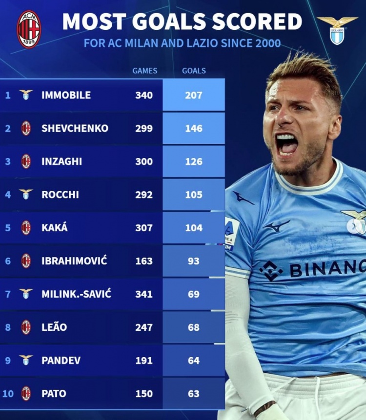 2025-03-03 05:02:03德轉(zhuǎn)列米蘭&拉齊奧新世紀(jì)射手榜:因莫比萊居首,舍瓦、伊布在列