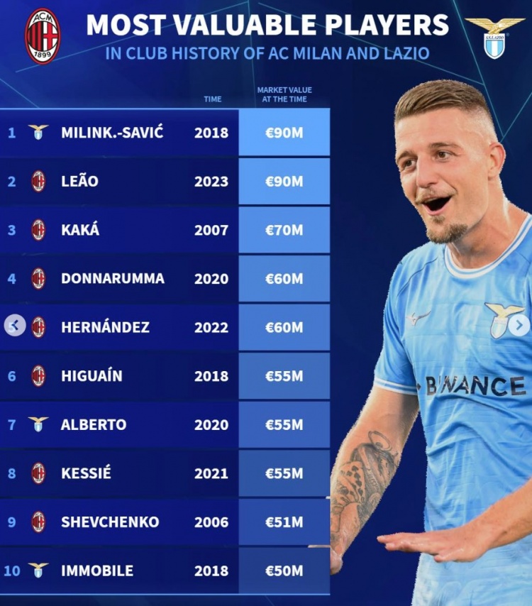 2025-03-03 05:02:05米蘭&拉齊奧歷史德轉身價最貴榜:米林&萊奧9千萬 卡卡07年7千萬