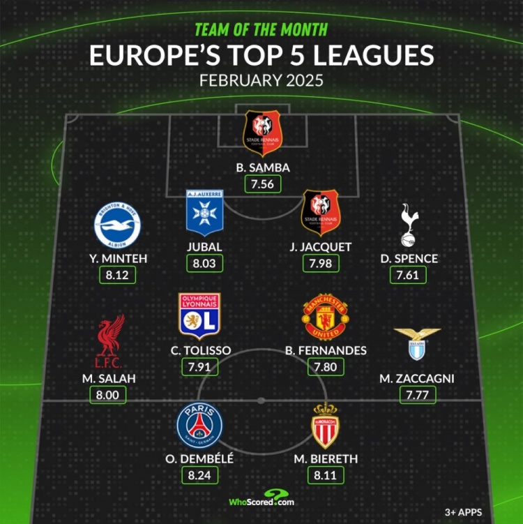 2025-03-03 10:16:34whoscored五大聯賽2月最佳陣:B費&薩拉赫領銜 登貝萊&比雷斯在列