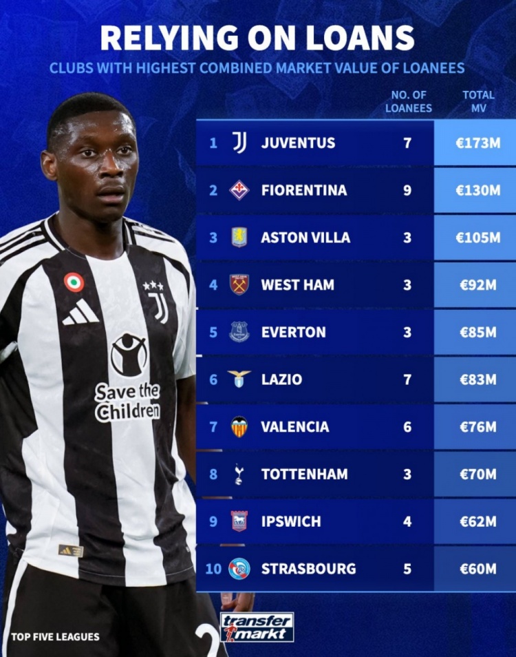 2025-02-19 20:28:59租借球員總身價榜:尤文1.73億歐居首,維拉1.05億歐第3,熱刺第8
