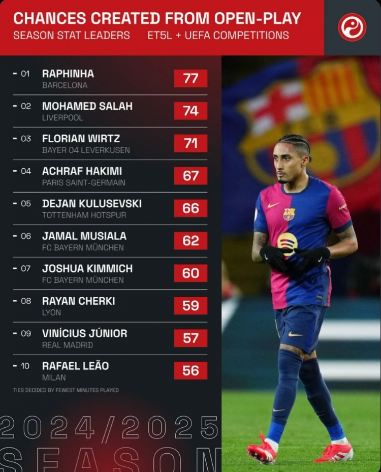 2025-03-03 20:04:36本賽季五大聯(lián)賽球員運(yùn)動(dòng)戰(zhàn)創(chuàng)造機(jī)會(huì)榜:拉菲尼亞居首,薩拉赫次席