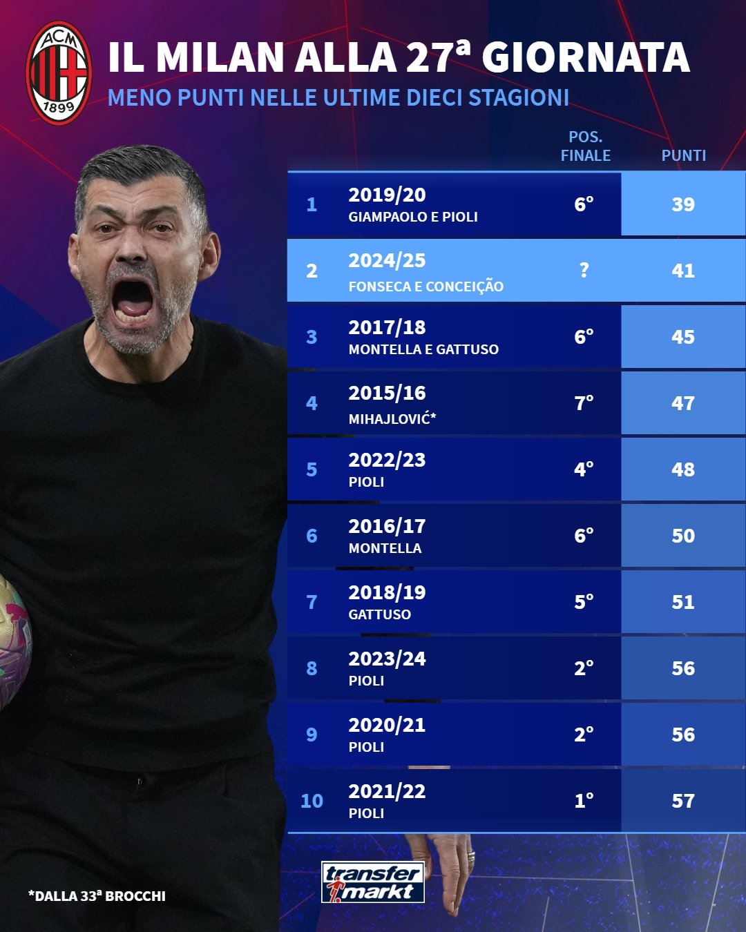 27輪41分是米蘭過去10年意甲同期的第二低分,僅高于2019/20賽季的39分,那個賽季球隊最終排名意甲第六位。