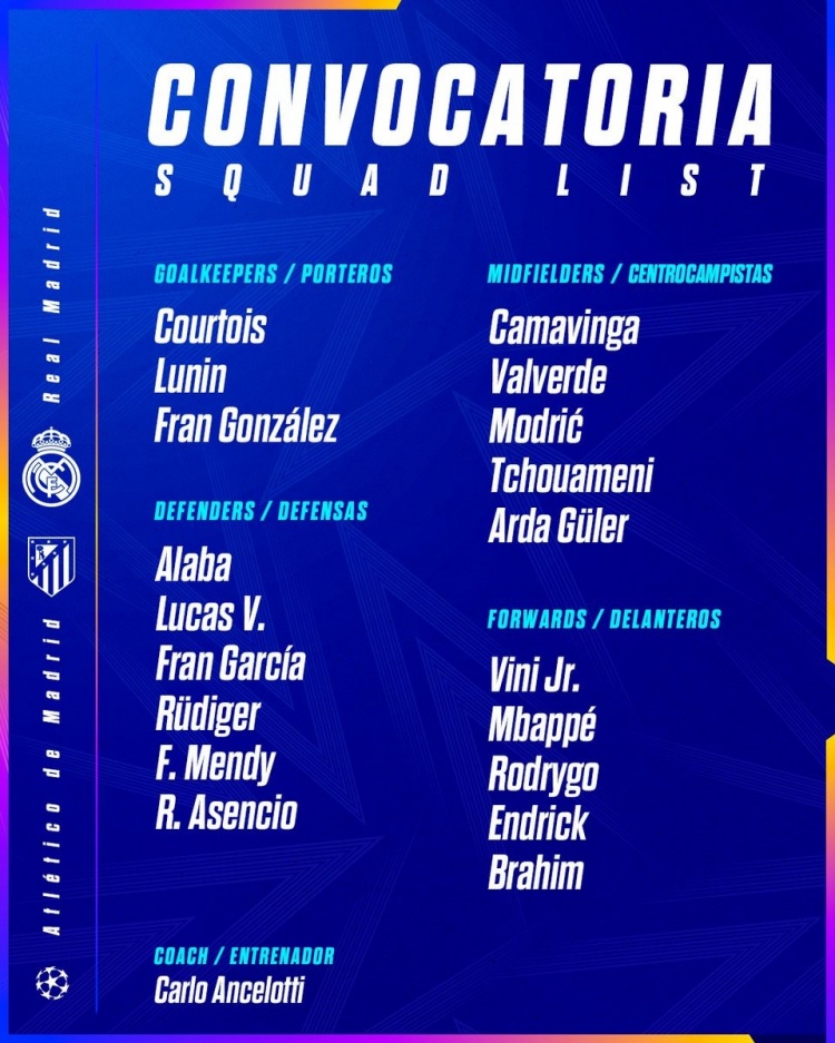2025-03-04 05:00:27皇馬歐冠19人名單:姆巴佩領銜&貝林厄姆停賽,巴爾韋德火線復出