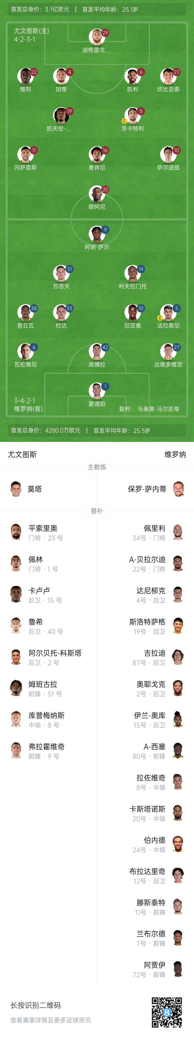 尤文首發:29-迪格雷戈里奧、22-維阿、4-加蒂、6-凱利、27-坎比亞索、5-洛卡特利、19-凱夫倫-圖拉姆、10-伊爾迪茲、16-麥肯尼、11-尼古拉斯-岡薩雷斯、20-穆阿尼