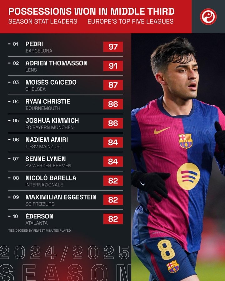 3月4日訊 Squawka統計表明,佩德里是本賽季五大聯賽在中場區域搶回球權次數最多的球員。
