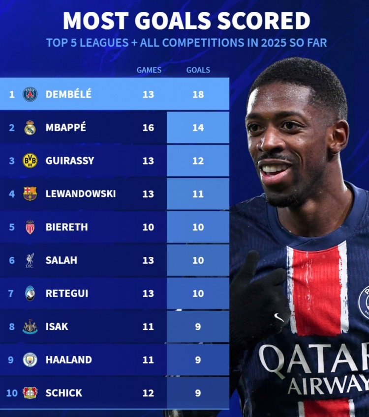 2025-03-04 17:47:542025各項(xiàng)賽事進(jìn)球榜:登貝萊18球居首,姆&哈、萊萬(wàn)、薩拉赫在列