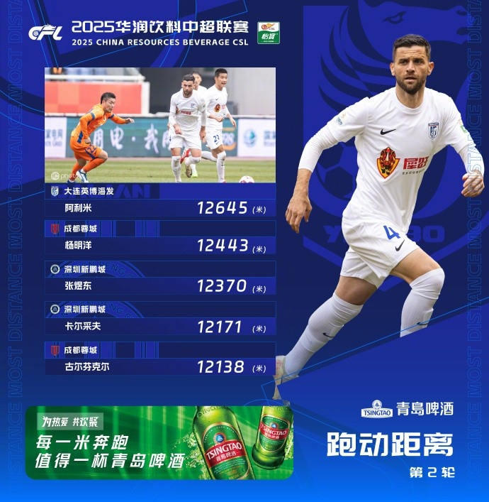 2025-03-04 23:25:35中超第2輪跑動榜:阿利米12645米居首,蓉城、新鵬城各兩人上榜