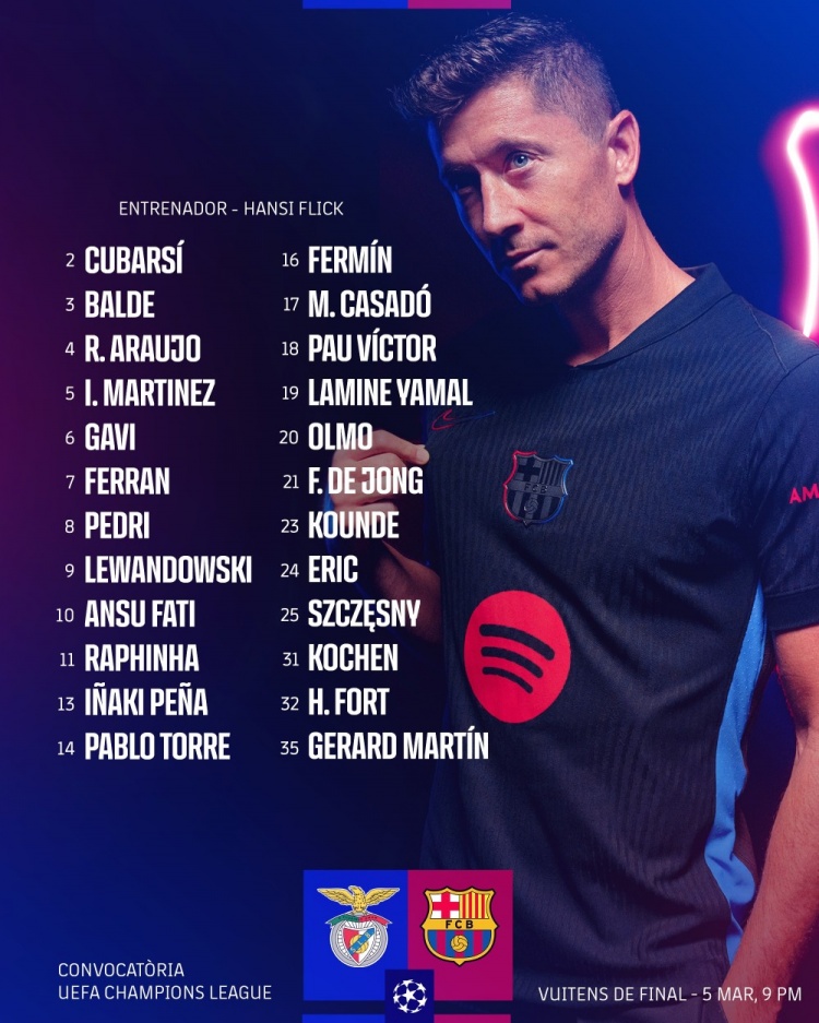 2025-03-04 23:31:22巴薩歐冠客戰本菲卡名單:萊萬、亞馬爾、加維、奧爾莫在列