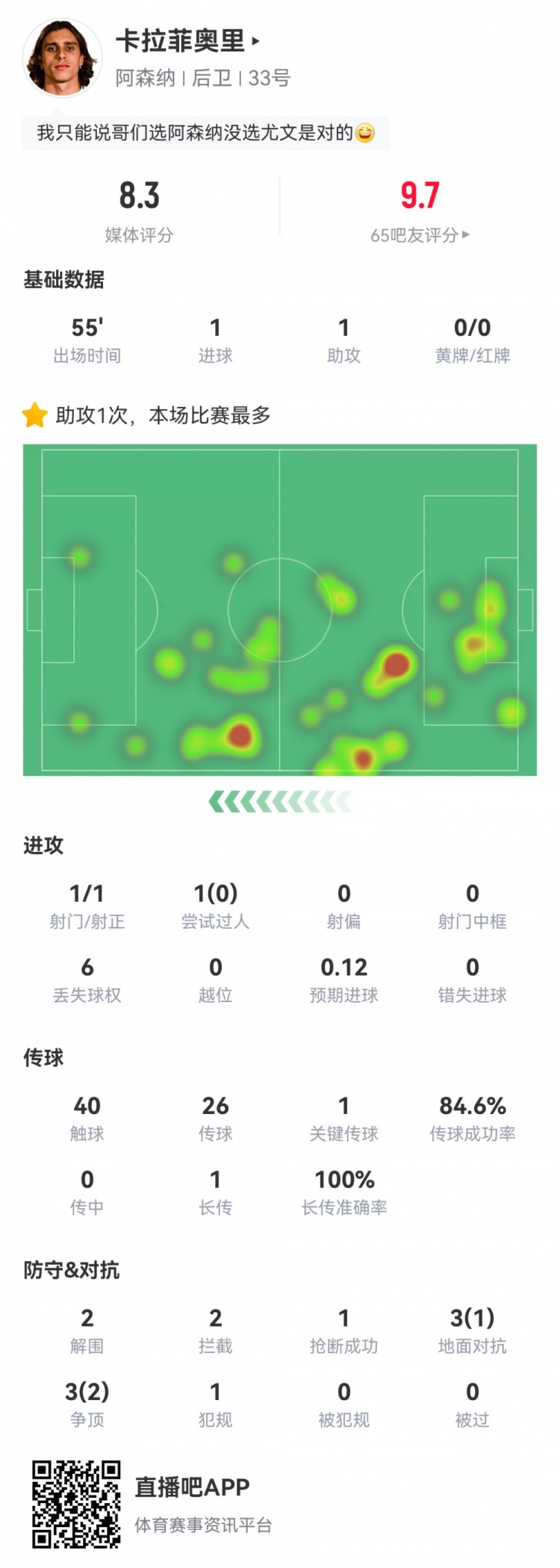 2025-03-05 06:54:34卡拉菲奧里數據:替補55分鐘傳射建功,2次解圍2次攔截,評分8.3