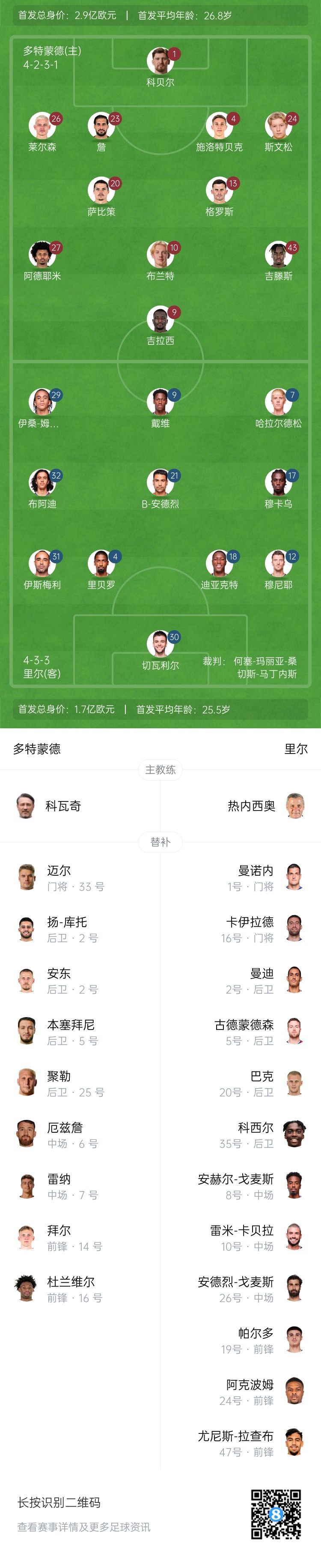 3月5日訊 歐冠16強首回合,多特主場迎戰里爾比賽即將打響。賽前首發出爐。