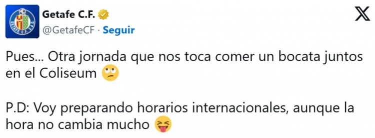赫塔菲將于本周日下午14:00對(duì)陣馬競(jìng),而他們下個(gè)主場(chǎng)對(duì)陣萊加內(nèi)斯的比賽也是在下午14:00進(jìn)行。與此同時(shí),西甲聯(lián)賽宣布了第29輪的賽程,赫塔菲再次在下午14:00主場(chǎng)迎戰(zhàn)比利亞雷亞爾,俱樂部在社交網(wǎng)絡(luò)上調(diào)侃這一賽程。