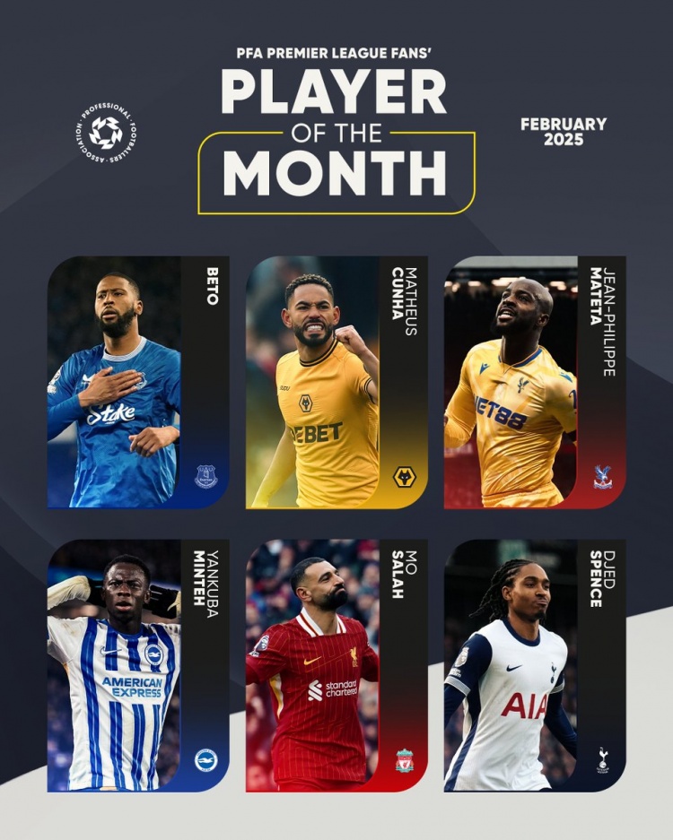 2025-03-06 00:10:09PFA英超2月最佳候選:薩拉赫、庫(kù)尼亞、馬特塔、斯賓塞在列