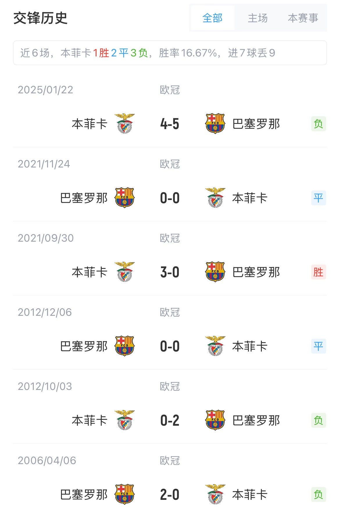 巴薩與本菲卡歷史共交手10次,巴薩4勝4平2負。兩隊本賽季歐冠聯賽階段同組,巴薩客場5-4絕殺本菲卡。