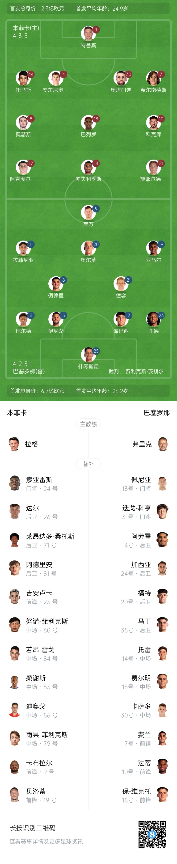 巴薩首發:25-什琴斯尼、2-庫巴西、3-巴爾德、5-伊尼戈-馬丁內斯、23-孔德、8-佩德里、21-德容、20-奧爾莫、19-亞馬爾、11-拉菲尼亞、9-萊萬