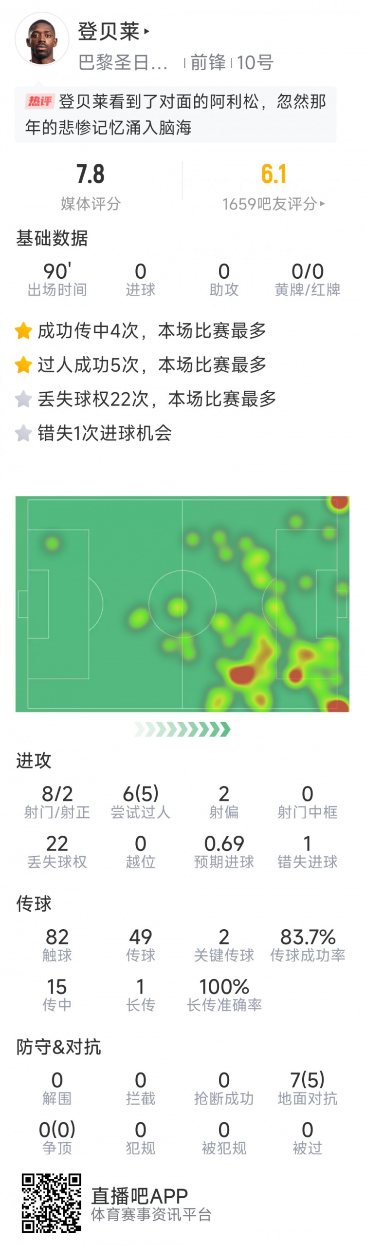 2025-03-06 13:12:34登貝萊本場數據:8射2正,1次錯失良機,2次關鍵傳球,5次過人