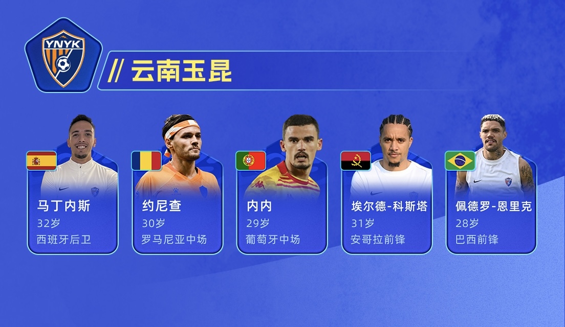 目前云南玉昆的外援有馬丁內斯、約尼查、內內、佩德羅-恩里克以及埃爾德-科斯塔,其中馬丁內斯、約尼查、內內、佩德羅-恩里克,四人都代表云南玉昆參加了前兩輪中超比賽,只有埃爾德-科斯塔還未出場。