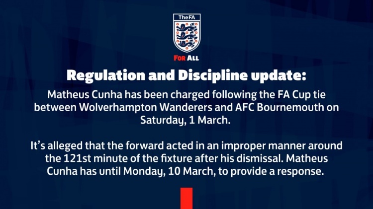 英足總官方表示:“在3月1日足總杯狼隊對陣伯恩茅斯的比賽之后,對庫尼亞提出指控,這位前鋒在被罰下后行為不當,他必須在3月10日周一之前做出回應。”