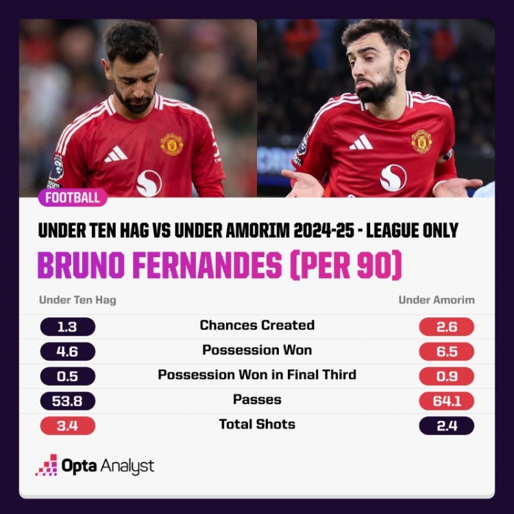 2025-03-06 22:39:40曼聯本賽季換帥后:B費射門下降,創造機會&贏得球權等數據均提升
