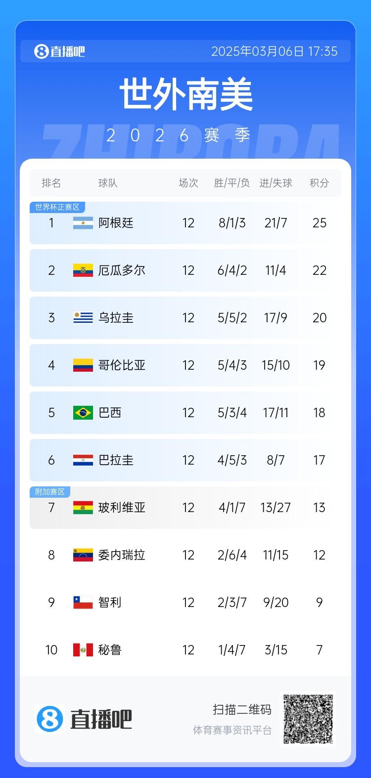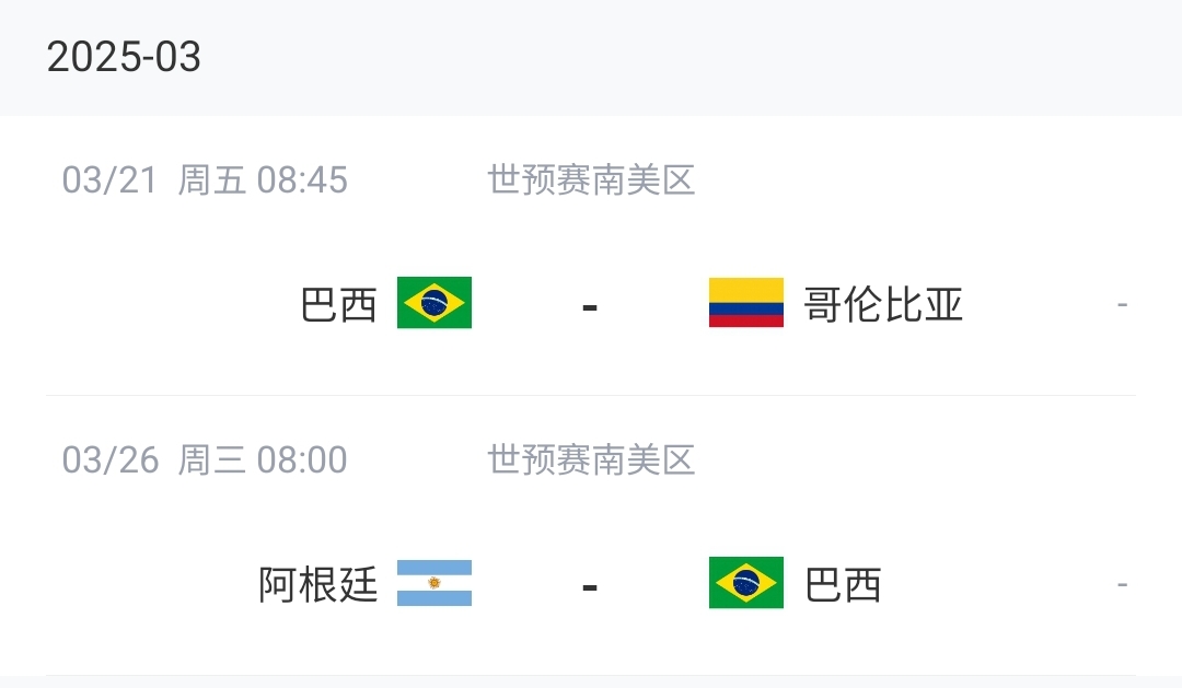 在3月份的世預(yù)賽中,巴西將先后交手哥倫比亞和阿根廷,目前巴西隊5勝3平4負積18分,位列第5。