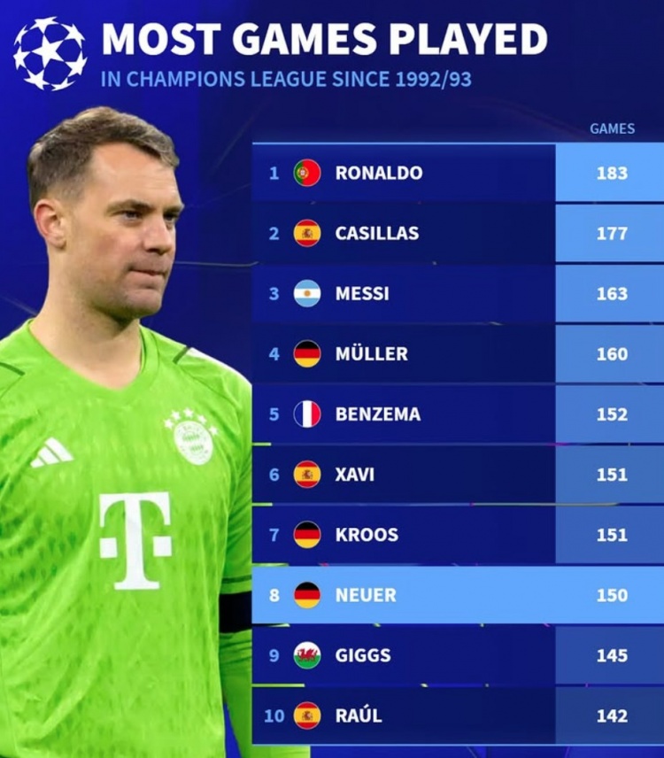 改制后歐冠出場榜:C羅183場、梅西163場,諾伊爾150場列第8