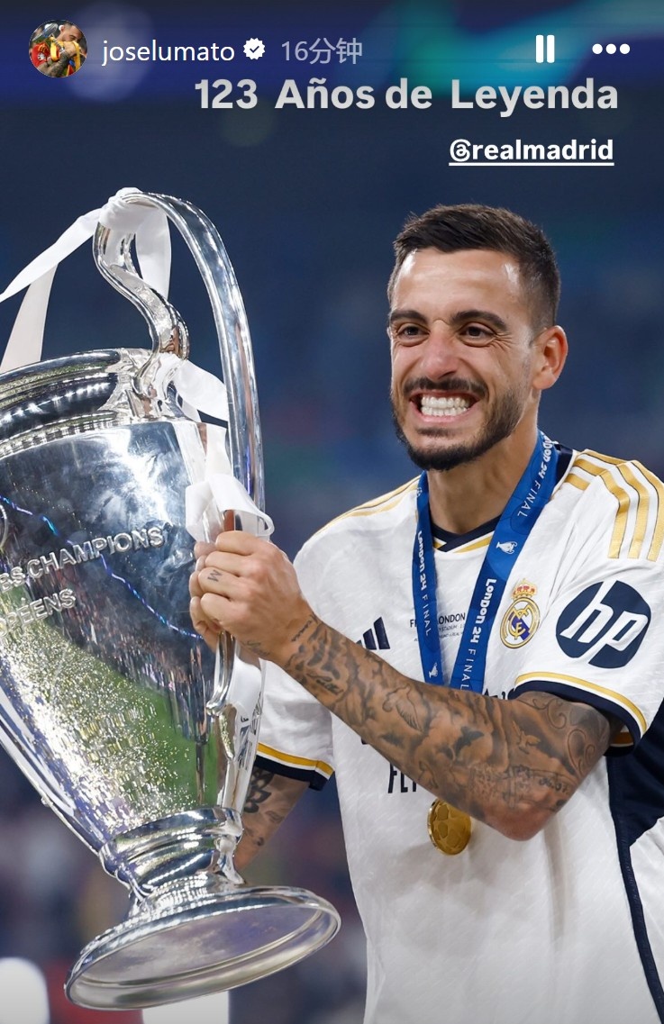 曾效力皇馬的34歲老將何塞盧更新社媒,曬出歐冠捧杯照并附文:123年的傳奇球隊。