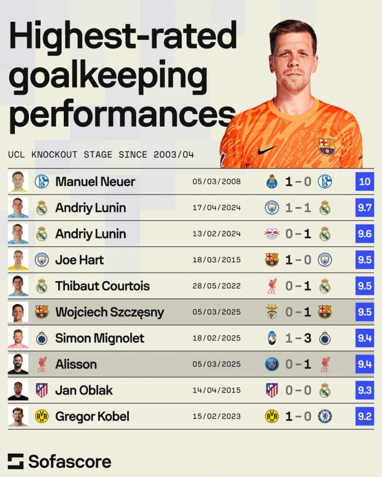 2025-03-07 06:44:27sofascore歐冠淘汰賽門將評分:08年諾伊爾唯一滿分 3C阿利森在列