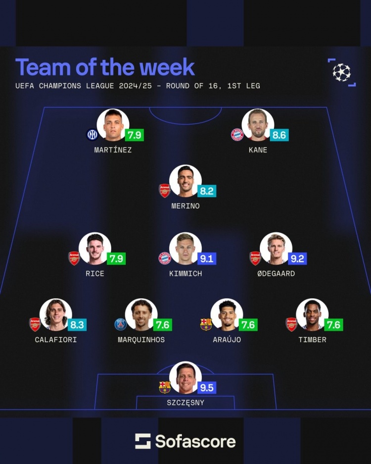 2025-03-07 06:44:34sofascore本輪歐冠最佳陣:厄德高領銜槍手5將,基米希、3C在列