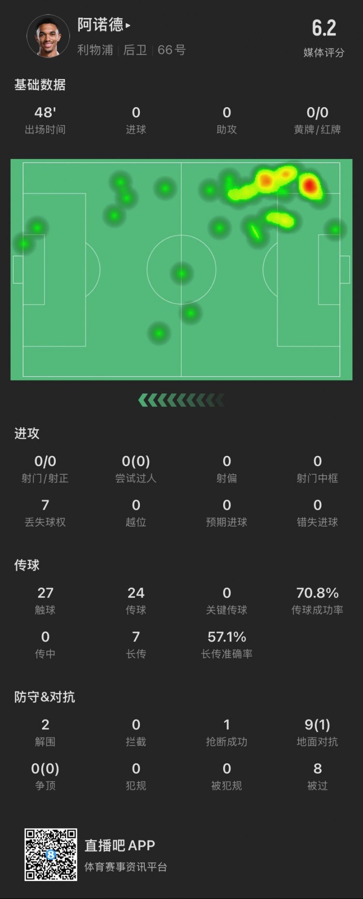 2025-02-24 15:05:28阿諾德半場:被過8次追平本賽季紀錄,9次對抗成功1次,貢獻2解圍